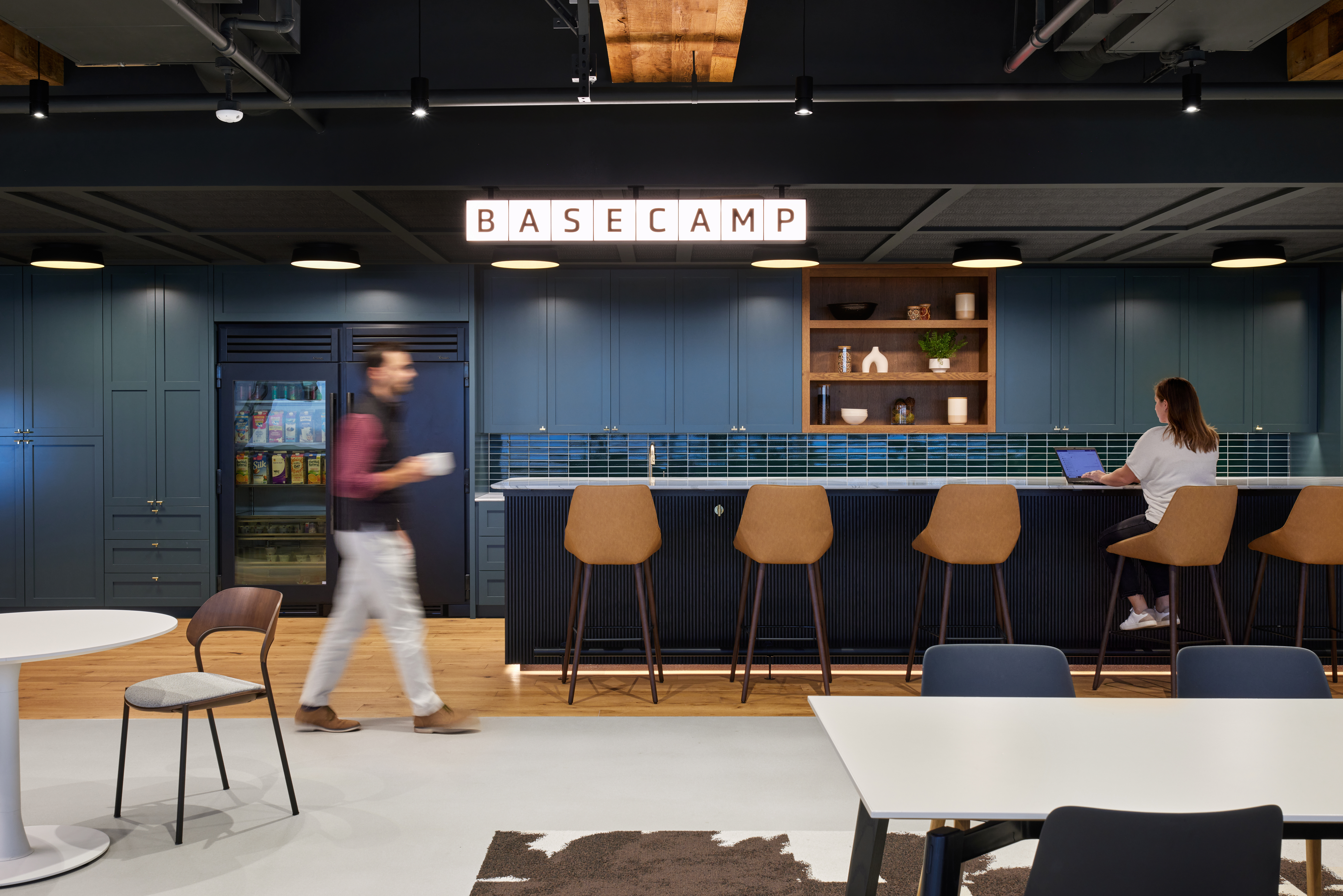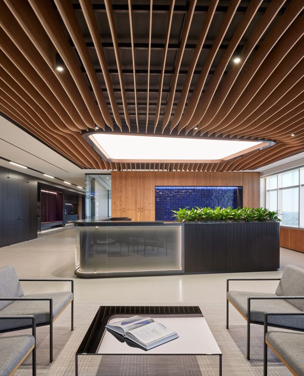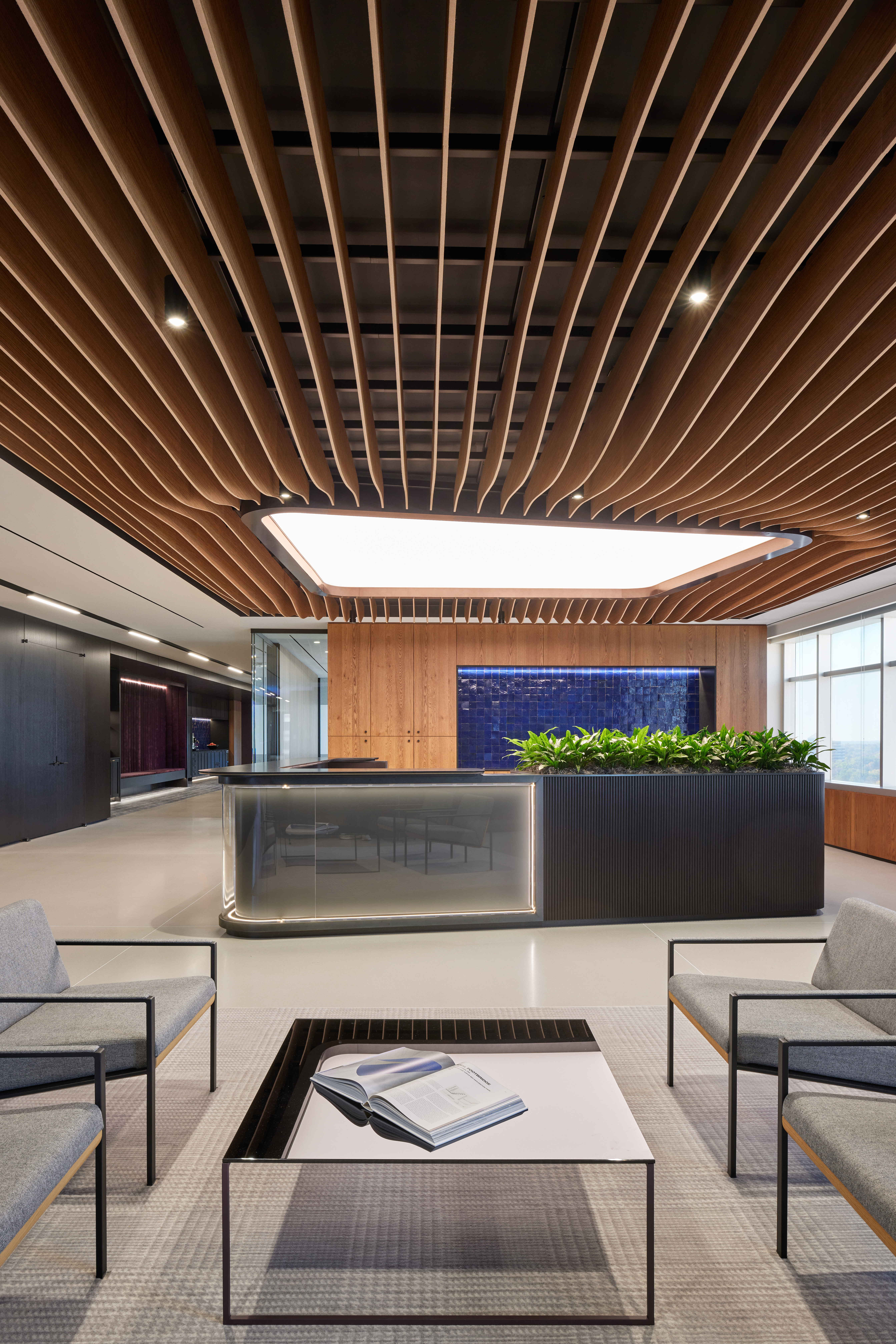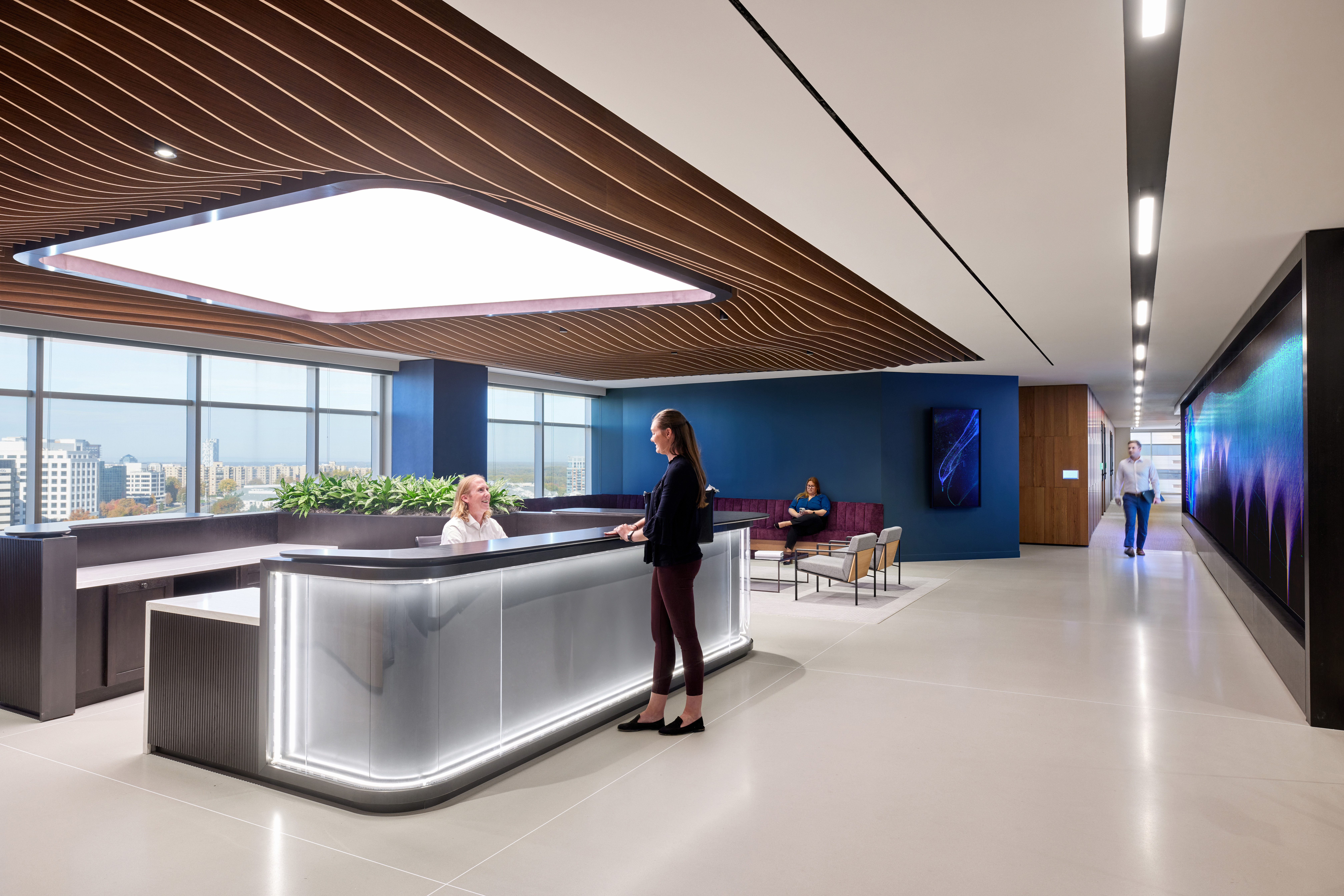 This client partnered with sshape to create a high-performing workspace that elevates the employee experience while meeting rigorous security requirements. The design integrates advanced protective measures, including biometric access control, private zones, and a secure SCIF suite. A monumental interconnecting stair serves as a central hub, promoting vertical movement and connection through several floors. A state-of-the-art conference center seamlessly flows into an adjoining innovation lounge, providing an elevated client experience. This integration effortlessly combines cutting-edge AV for conference training programs, while the innovation lounge offers full amenities for breakout sessions, heads down work, and informal collaboration. Recognizing the diverse work styles of its multi-generational workforce, the design offers a welcoming café and coffee bar for casual interaction, while an Old-English inspired library provides a sanctuary for quiet work. Biophilic design principles come alive in a lush indoor greenhouse, adorned with playful graphics, offering a unique space for rejuvenation and inspiration that brings the outdoors inside. The holistic approach creates a dynamic work environment that sparks idea exchange and teamwork, ultimately contributing to employee well-being and organizational success.