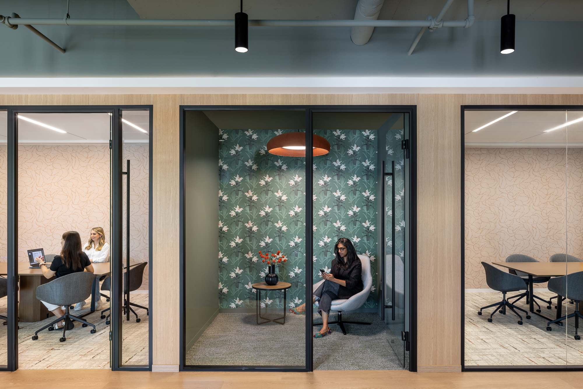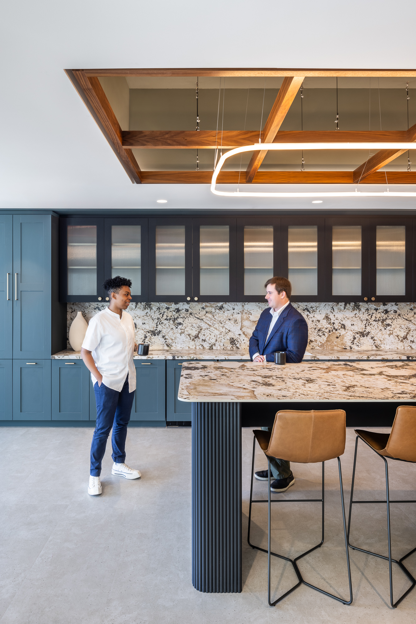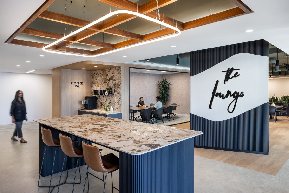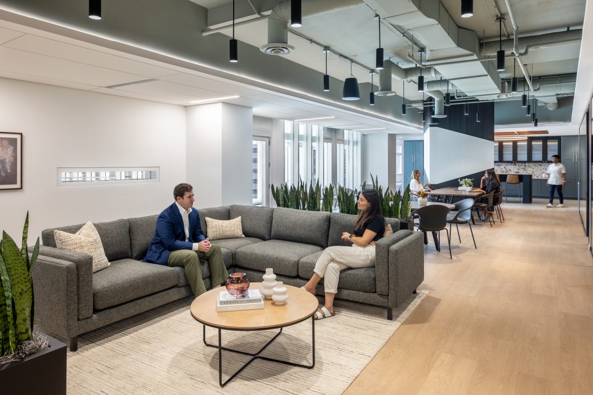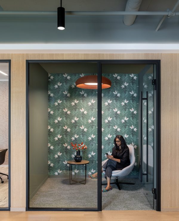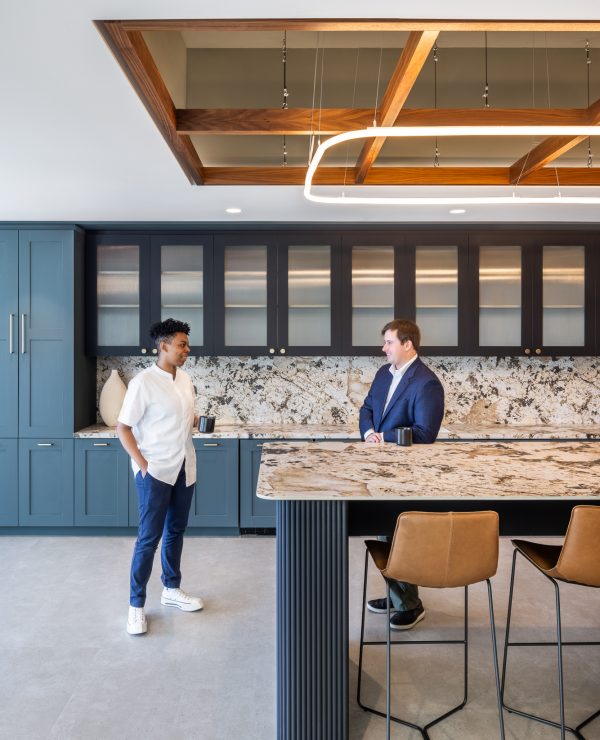 sshape partnered with JLL and AREP to re-design Inventa Towers in downtown Silver Spring, MD, revitalizing the previously outdated building to attract new tenants. Drawing inspiration from Silver Spring's historical roots—specifically the mica-flecked spring discovered by Francis Preston Blair—the amenity floors feature details echoing mica flakes, alongside organic shapes and a nature-inspired color palette with warm woods. The 8th floor at Inventa Towers now includes four spec suites surrounding a central communal townhall. The townhall has a full coffee bar and kitchen, providing tenants with a versatile space for hosting events. Adjacent to the kitchen, a variety of meeting spaces and seating arrangements are available, including both enclosed and open rooms, with a connecting wellness room. Two of the four spec suites were leased immediately and sshape is currently developing a similar layout for the 9th floor of the building, with completion anticipated in 2026.
